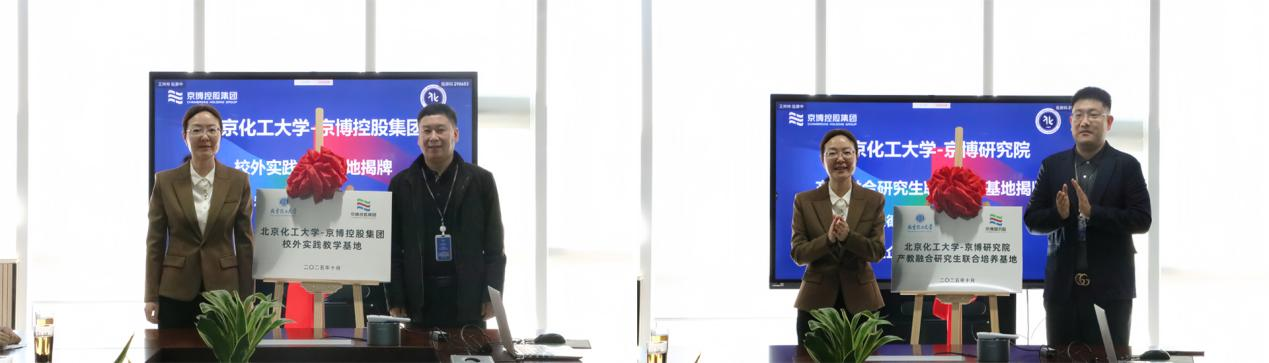 随后,与会领导为北京化工大学与京博控股集团校外实践教学基地、北京化工大学与京博研究院产教融合研究生联合培养基地揭牌。双基地的运行落地,标志着双方从学生实践培养到高层次人才联合培育的合作体系全面成型。会议还围绕学生校企联合培养机制建设达成重要共识,未来将通过企业实训聚焦技术工程化和生产应用指导,通过校内导师提供理论支撑,从课题选题阶段便共同参与,确保研究方向贴合企业实际需求,实现化学拔尖人才培养“理论+实践”双提升。