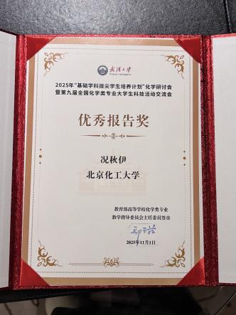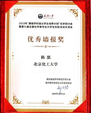 学生报告分为两个会场,34位本科生分别代表各自学校进行了口头报告。我院基地2201班的况秋伊同学代表我校做了题为“基于化学发光动力学的UiO66缺陷识别与定量”的口头报告,并与现场同学进行了深入热烈的讨论与交流,获得优秀报告奖。交流活动墙报展示环节,我院基地2201班程实、优培2201班陈湉、应化2304韩峰和基地2301班刘张墨涵四位同学将各自的科研成果进行了墙报展示和交流讨论,感觉收获颇丰。经师生点赞海选,陈湉同学获得优秀墙报奖。在墙报展示和学术报告交流中,来自全国不同高校的同学们互相学习,碰撞出思维的火花,体验了科学精神,结交了新朋友,也增长了新见识。