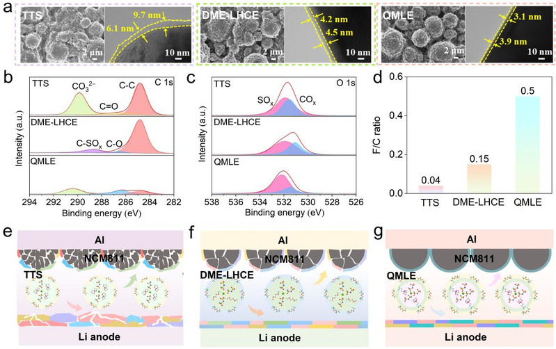 图3 循环NCM811正极在TTS、DME-LHCE和QMLE中的形貌及界面成分表征