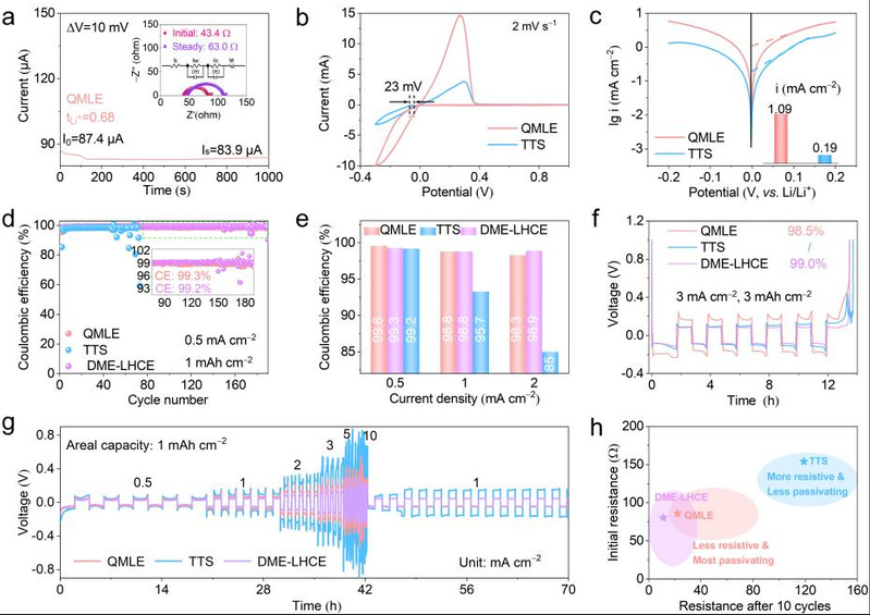 研究表明,−CF3锚定链段所产生的强分子内相互作用削弱了ETMOS的溶剂化能力,形成了阴离子主导的溶剂化鞘,结合高闪点,使电解液具有更优异的耐高温稳定性。含有QMLE的Li||Cu电池在3 mA cm-2和3 mAh cm-2的条件下实现了高达98.5%库仑效率;Li||NCM811(11.5 mg cm-2)电池在4.6 V高充电截止电压及30-70 °C的高温范围内实现了稳定运行。本研究为实现今后拓宽高电压和高温条件下锂金属二次电池的商业化提供了一种可参考的电解液设计策略。