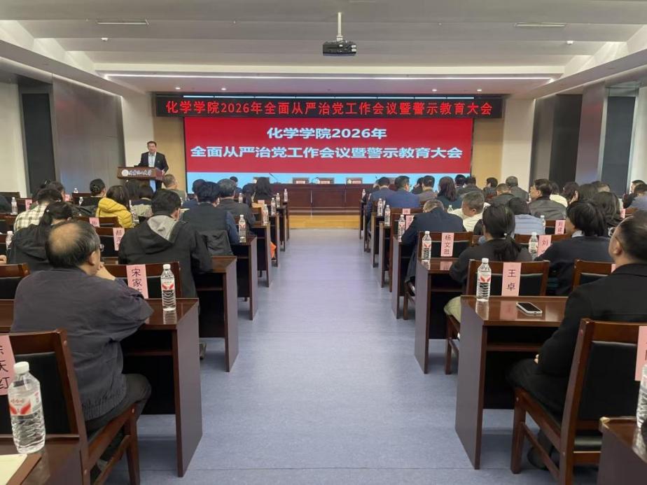 4月10日下午,化学学院在会议中心多功能厅召开2026年全面从严治党工作会议暨警示教育大会。会议坚持以习近平新时代中国特色社会主义思想为指导,全面贯彻党的二十大、二十届历次全会精神和二十届中央纪委五次全会精神,传达学校党委2026年全面从严治党工作要点,通报教育系统及学校典型警示教育案例,对学院全面从严治党工作进行部署。学院领导班子成员、全体教职工参会,会议由学院党委书记尹平主持。
