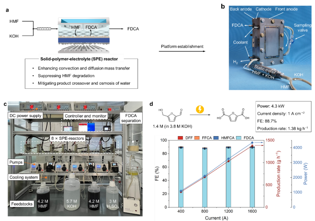 The research team proposed an engineered SPE-reactor to steer Faradaic and non-Faradaic side reactions, achieving FDCA production at industrially relevant current density (1.5 A cm−2), while maintaining high selectivity (97.0%), Faradaic efficiency (88.2%) and concentration (~1.24 M). The key roles of the reactor include: suppressing Faradaic oxygen evolution by strengthening mass transfer; alleviating non-Faradaic HMF condensation; mitigating undesired crossover of molecules between cathode and anode. The stability of the SPE-reactor was demonstrated in a continuous operation at 0.5 A cm−2 over 140 hours. Furthermore, they demonstrated an engineered SPE-reactor and modular electrochemical platform to enable selective electrooxidation of high-concentration 5-hydroxymethylfurfural (HMF) to FDCA at kW-scale (4.3 kW) and ampere-level current density (1.0 A cm−2). These results represent an important step toward large-scale electrosynthesis of sustainable plastic monomers from biomass.
