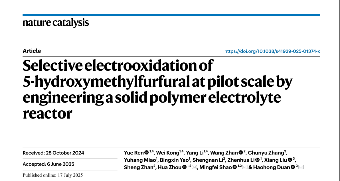 Shao’s team designed a solid polymer electrolyte (SPE) reactor to address the key challenges in the selective electrosynthesis of high-concentration 2,5-furandicarboxylic acid (FDCA) at kilowatt scale and ampere-level current density. This research results were published in “Nature Catalysis” with titled “Selective electrooxidation of 5-hydroxymethylfurfural at pilot scale by engineering a solid polymer electrolyte reactor”.